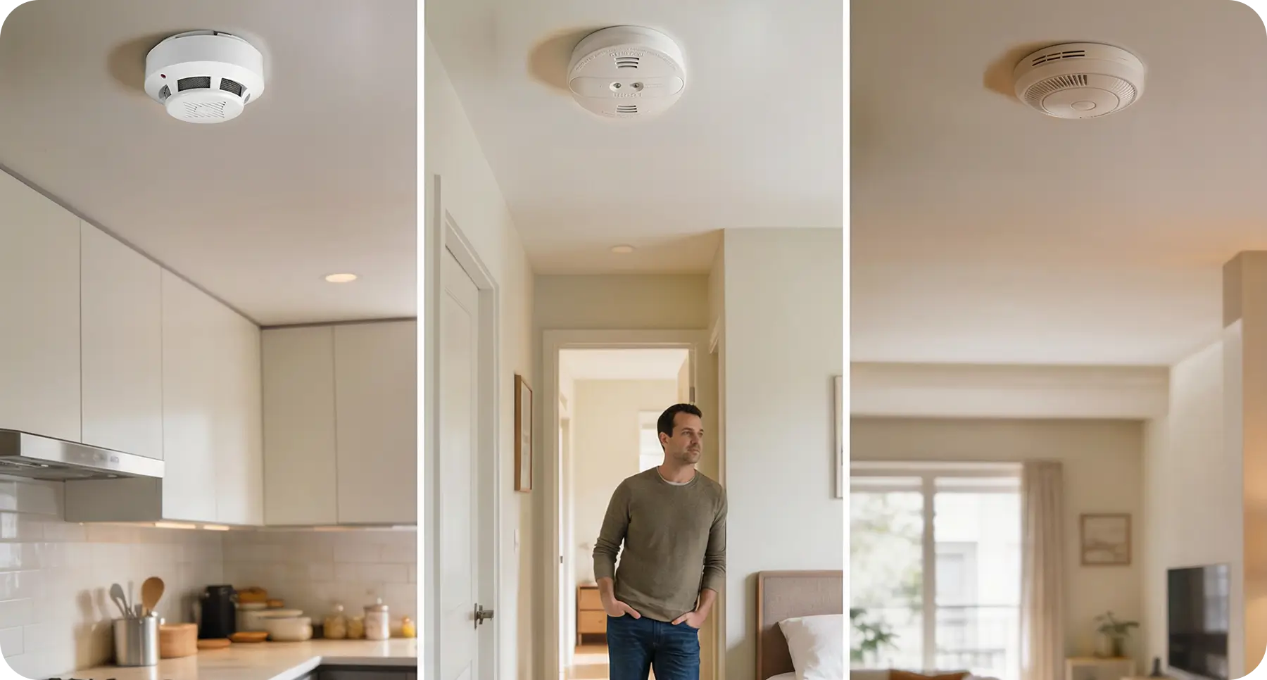 - Bedrooms and hallways: Dual-sensor smoke detectors